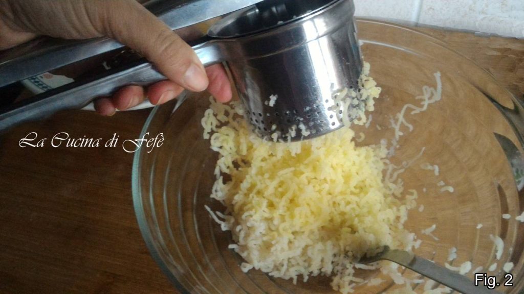 Lavez soigneusement sous l’eau courante les pommes de terre, en éliminant tous les résidus de terre. Mettez-les dans une casserole sans les éplucher avec de l’eau salée, portez à ébullition et faites cuire env. 25′ ou jusqu’à ce que les dents d’une fourchette puissent y pénétrer (fig. 1).