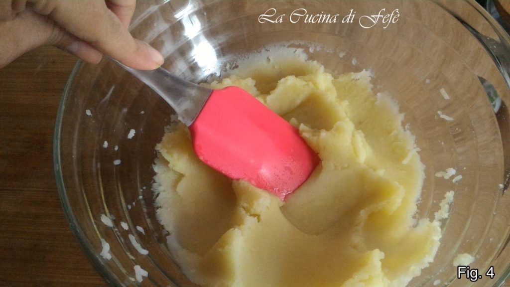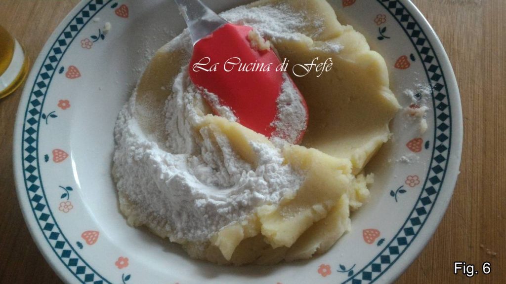 À ce stade, ajoutez la fécule de pomme de terre préalablement tamisée, en mélangeant bien (fig. 6). Enfin, ajoutez également la paprika et ajustez le sel (fig. 7).