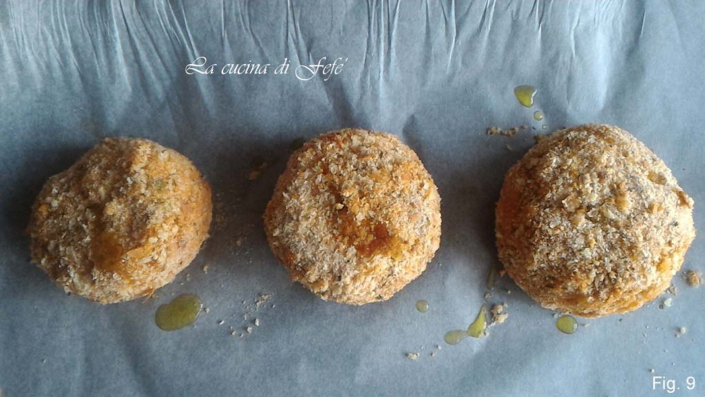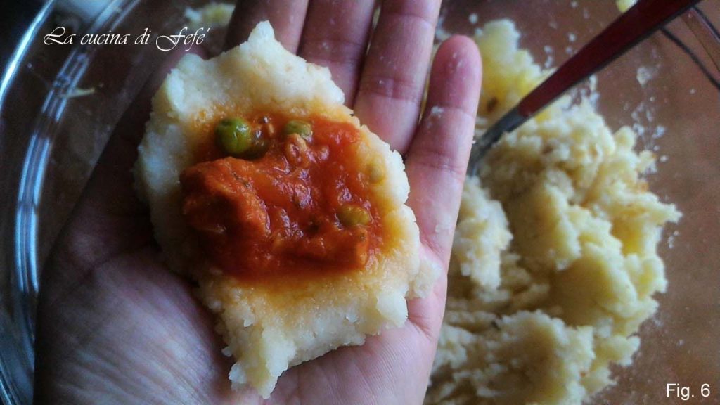Lavez les pommes de terre, faites-les cuire dans une grande quantité d’eau pendant env. 25′, jusqu’à ce qu’elles soient tendres. Égouttez-les, et encore chaudes, retirez la peau, puis écrasez-les avec un presse-purée. Ajoutez l’œuf, le parmesan et un peu de lait. Salez, poivrez, complétez avec 4 cuillères de chapelure et mélangez (fig. 1).