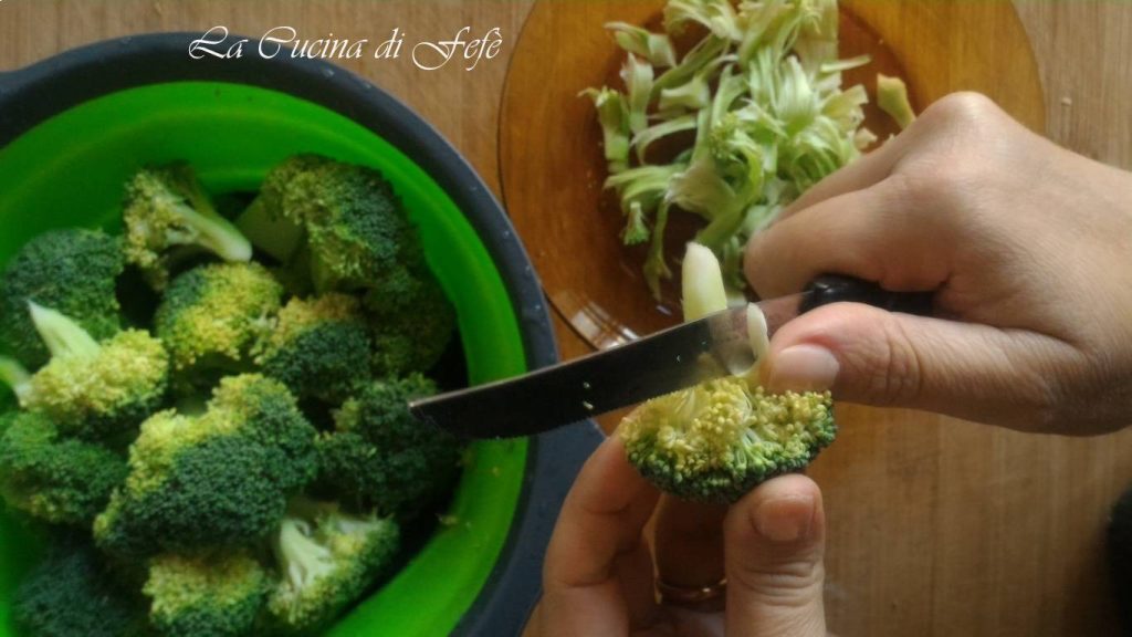 • Nettoyez la tête de brocoli, en la réduisant en bouquets et en enlevant la pellicule extérieure qui les recouvre, puis lavez-les sous l’eau courante.