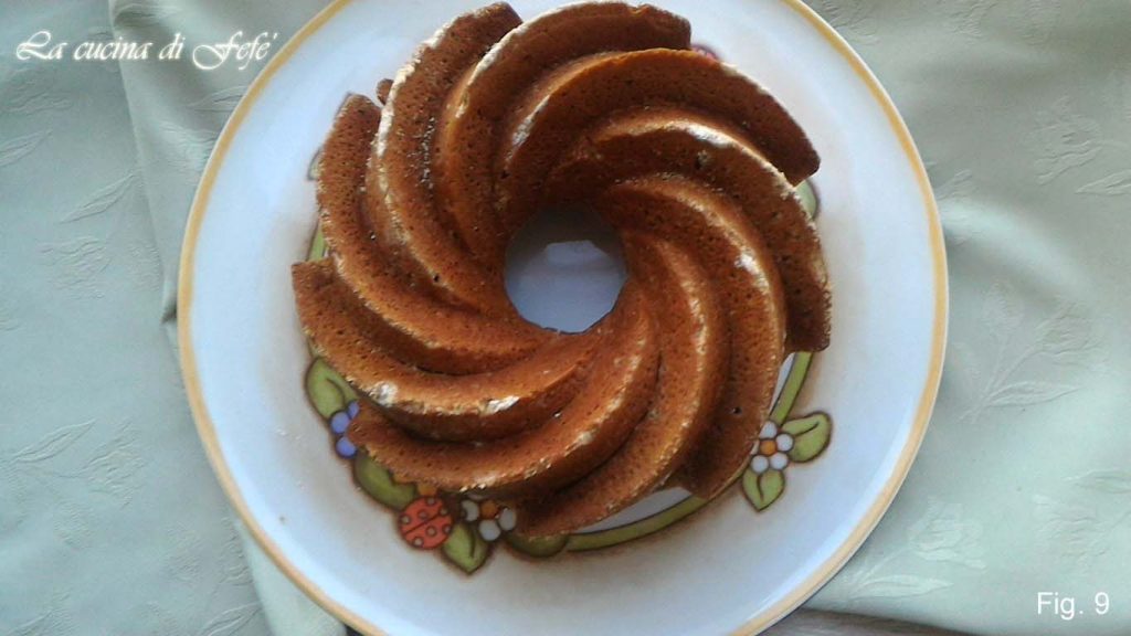 Mettez au four statique préchauffé à 180°C pendant 25′. Le test du cure-dent fera foi. Sortez du four et laissez entièrement refroidir à température ambiante avant de le démouler (fig. 9).