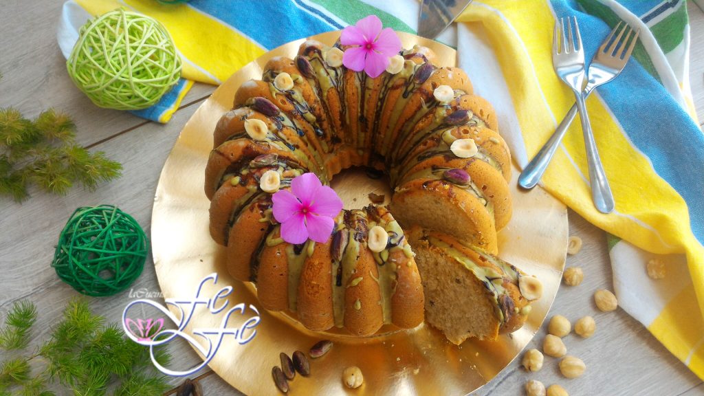 À l’occasion du deuxième rendez-vous du mois pour la rubrique Le Granaio, me voici avec un gâteau riche en fruits à coque, et plus précisément, à base de noisettes et pistaches de Bronte! Un bundtcake préparé pour une chère amie intolérante au gluten, donc avec uniquement des ingrédients qui en sont totalement dépourvus! L’idée était de marier l’utile à l’agréable, en préparant un gâteau qui l’émotionne et contribue à la richesse du panier avec mes autres collègues! Je voulais donner un goût extrêmement noisetté à ce gâteau, et je dirais que j’ai largement réussi! En effet, les noisettes sont réduites quasiment en farine et ajoutées à la pâte avec l’amidon de maïs et la farine de riz! De plus, pour donner un goût encore plus prononcé, j’ai choisi de le parfumer davantage en ajoutant du yaourt et du lait à la noisette! Évidemment, étant donné que le bundtcake par définition est rarement servi uniquement avec du sucre glace, j’ai choisi de le garnir avec de la crème à tartiner aux noisettes et aux pistaches! En effet, la particularité de ce gâteau réside dans sa forme, aujourd’hui plus que par le passé, grâce aux rainures de chaque type capables d’accueillir au mieux n’importe quel glaçage de couverture! Une dernière considération que je pense nécessaire, pour préparer ce gâteau, il n’est pas nécessairement besoin de ce type de moule, vous pouvez aussi le faire dans un simple moule à savarin, mais ce ne sera pas la même chose, car l’esthétique fait partie de son sens. Réfléchissez-y!