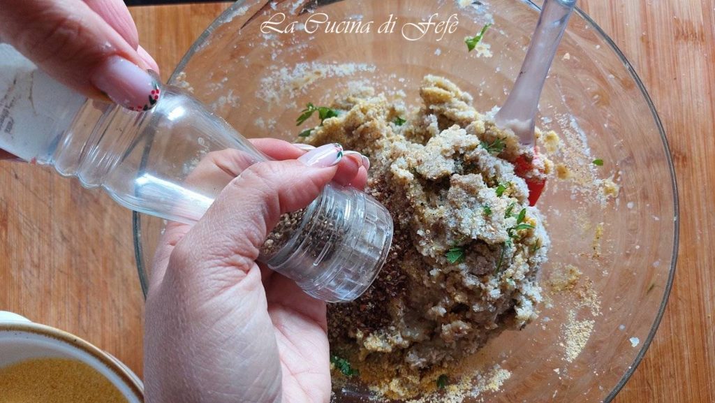 • Ajoute le persil haché finement, le grana râpé, la farine de maïs, l’ail en poudre et la noix de muscade.