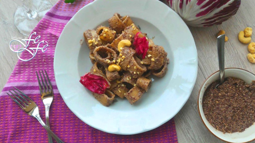 🟣Le choix des pâtes: bien que la calamarata soit idéale pour sa capacité à accueillir les sauces comme le pesto de chicorée et noix de cajou, c’est une option facultative. Je recommande quand même de vous orienter vers une typologie courte striée comme les penne, farfalle, fusilli ou orecchiette. La surface striée est parfaite pour « accrocher » le pesto. Les fusilli, en particulier, sont excellents car les spirales piègent les noix de cajou hachées et la crème de fromage, garantissant une distribution uniforme du condiment. Une autre alternative excellente est la pâtes Intégrales ou au sarrasin. Le goût rustique et légèrement grillé des farines intégrales se marie divinement avec la note amère de la chicorée. C’est le choix top pour ceux qui cherchent un plat fit et sain.