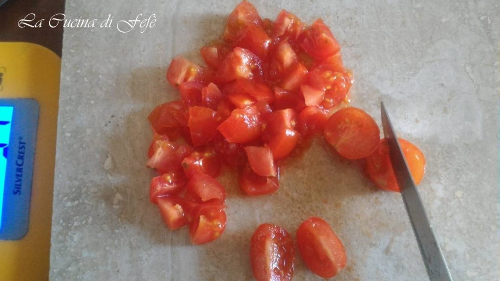 Occupez-vous également des tomates cerises : après les avoir rincées sous le jet d’eau courante, coupez-les en quartiers.