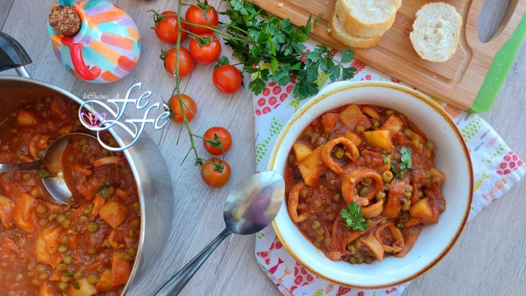 Le plat dont je vous parle aujourd’hui est un classique de la cuisine italienne, même si en toute franchise, je vous avoue que chez moi, ni ma grand-mère ni ma mère ne l’ont jamais préparé, ou du moins c’est ce dont je me souviens ! Et cela me semble assez incroyable vu la bonté infinie et la facilité extrême pour le réaliser ! Je parle des calamars en ragoût avec pommes de terre et petits pois, un second plat de mer très savoureux et riche, parfait pour saucer ! Habituellement, la cuisson des calamars est assez courte, mais dans cette préparation, elle nécessite des temps un peu plus longs, environ 40 minutes, mais cela en vaut vraiment la peine ! Avec quelques étapes simples aux fourneaux, vous apporterez à table de délicieux anneaux de calamar flambés au vin blanc et cuits à feu doux dans une sauce extraordinairement bonne à base de pommes de terre et de petits pois. Vous pouvez les réaliser aussi bien en blanc sans tomates ni coulis de tomates ou les enrichir davantage comme je l’ai fait ! Ce sera la parfaite soupe à déguster en famille encore chaude et fumante avec des croûtons de pain grillés ou aromatisés avec des herbes, épices et ail écrasé. Vous verrez que ce sera très apprécié de tous et cela deviendra votre atout en cuisine !