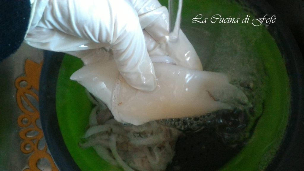Lavez les calamars déjà privés de bec et yeux abondamment sous l’eau courante, puis tamponnez-les avec du papier absorbant de cuisine.