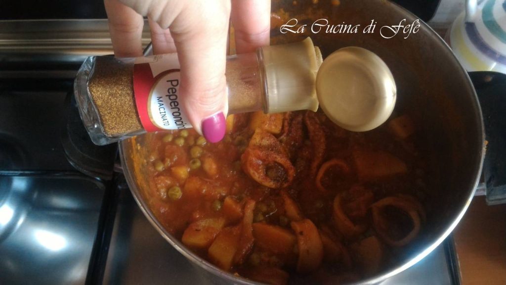 Couvrez avec un couvercle et laissez cuire les calamars à feu moyen-doux pendant environ 20′, en ajoutant de l’eau chaude seulement si nécessaire. Ensuite, ajoutez également les pommes de terre et laissez cuire encore 15′ supplémentaires.