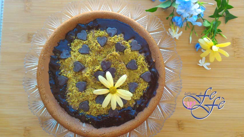 À la fin de la cuisson, éteignez le four, en le laissant fermé pendant encore 15-20′, puis sortez la cheesecake et laissez-la refroidir complètement. Ouvrez le moule, placez le gâteau sur une belle assiette et décorez avec une abondante farine de pistache, topping au chocolat sur les bords et cœurs en chocolat que j’ai moi-même créés en utilisant des moules.