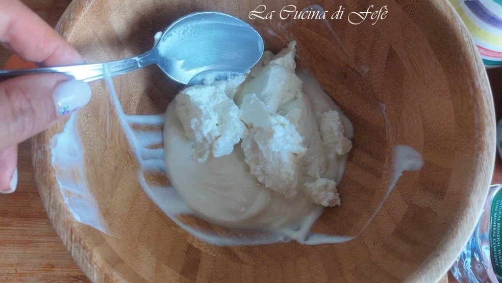 Dans une grande terrine, travaille avec une cuillère la ricotta égouttée avec le yaourt blanc.