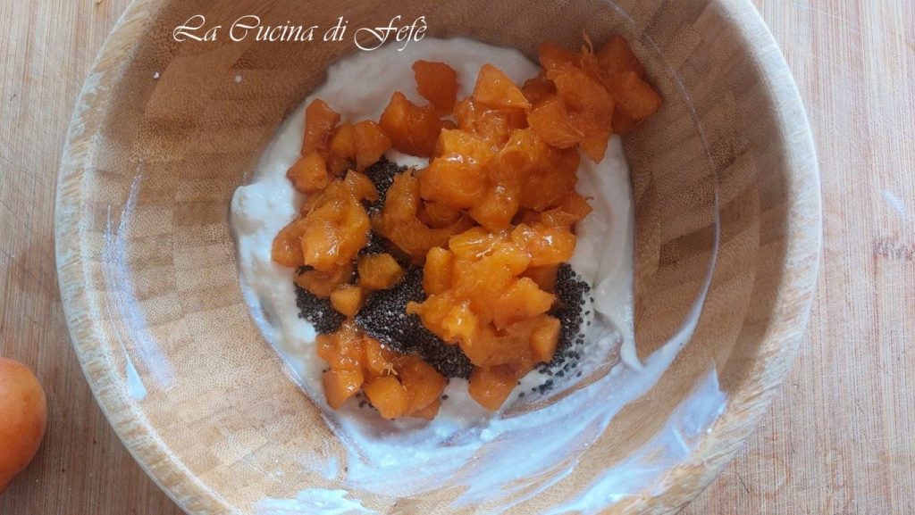 Lave les abricots sous l’eau courante, épluche-les, enlève le noyau interne et coupe-les en petits dés.
