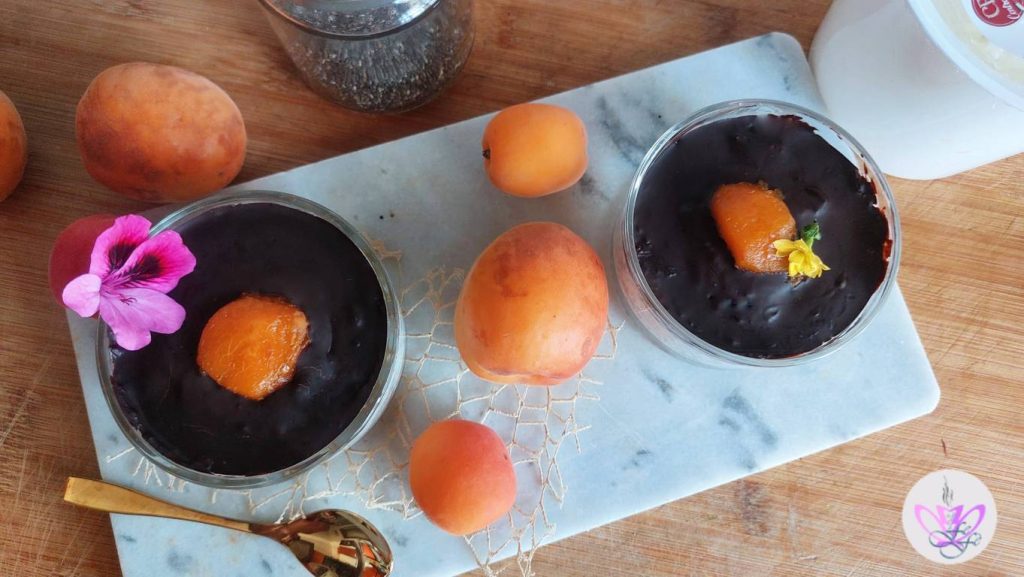 Divise en deux l’abricot réservé pour la décoration finale et garnis. Place les deux bols au réfrigérateur recouverts de film alimentaire (je recycle les couvercles en plastique des yaourts) toute la nuit ou au moins pour 3 h.