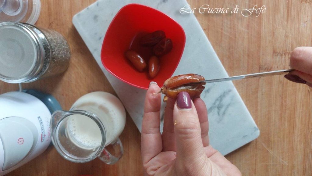 Comme je l’ai déjà raconté plusieurs fois ici sur le blog et les réseaux sociaux, ces derniers temps, pour ceux qui aiment un petit-déjeuner sain et rassasiant, le chia pudding est très à la mode, une sorte de pudding crémeux originaire d’Amérique centrale à base de graines de chia! Ces petites graines sombres sont riches en acides gras essentiels comme les Oméga-3 et Oméga-6, fibres et minéraux. Il va de soi que leur consommation quotidienne représente un choix valable pour un petit-déjeuner super nutritif et authentique. De plus, pour ceux qui sont toujours pressés, c’est idéal car il ne nécessite pas de cuisson, mais juste le trempage des graines dans un liquide quelconque pour au moins 30 minutes. Cependant, si vous le préparez la veille, ce sera encore mieux ! Aujourd’hui, je vous propose une version très particulière à base de dattes, qui seront l’édulcorant naturel de cette préparation, et de cannelle. Et pour rendre le tout plus gourmand, j’ai ajouté des copeaux de chocolat noir capables d’améliorer l’humeur et la concentration, offrant un soutien énergétique pendant votre journée ! Essayez-le au petit-déjeuner, comme dessert après un repas dans les moments où vous avez le plus besoin de consommer quelque chose de sucré, ou comme collation saine ! Vous allez l’adorer !
