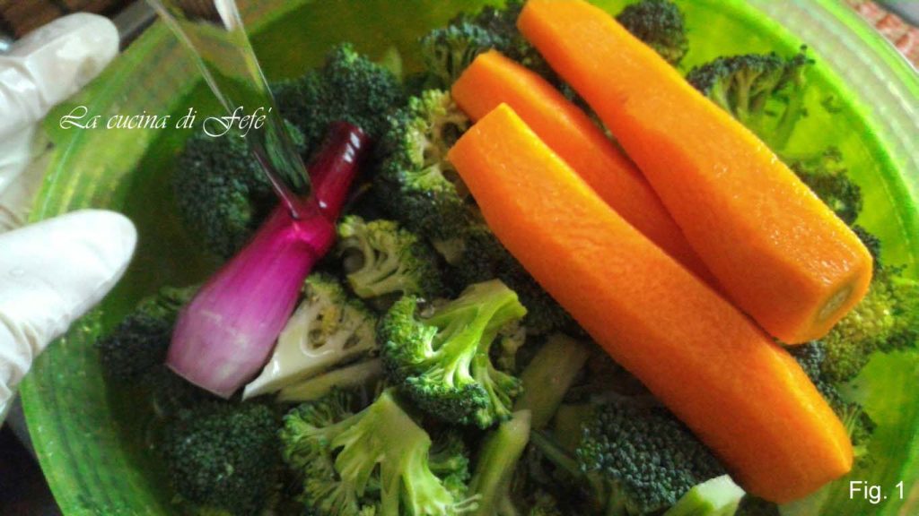 • Coupe les carottes en rondelles, puis plonge-les avec les brocolis et les petits pois dans de l’eau bouillante salée pendant 5′, égoutte-les et passe-les quelques instants dans de l’eau froide pour qu’ils restent croquants.