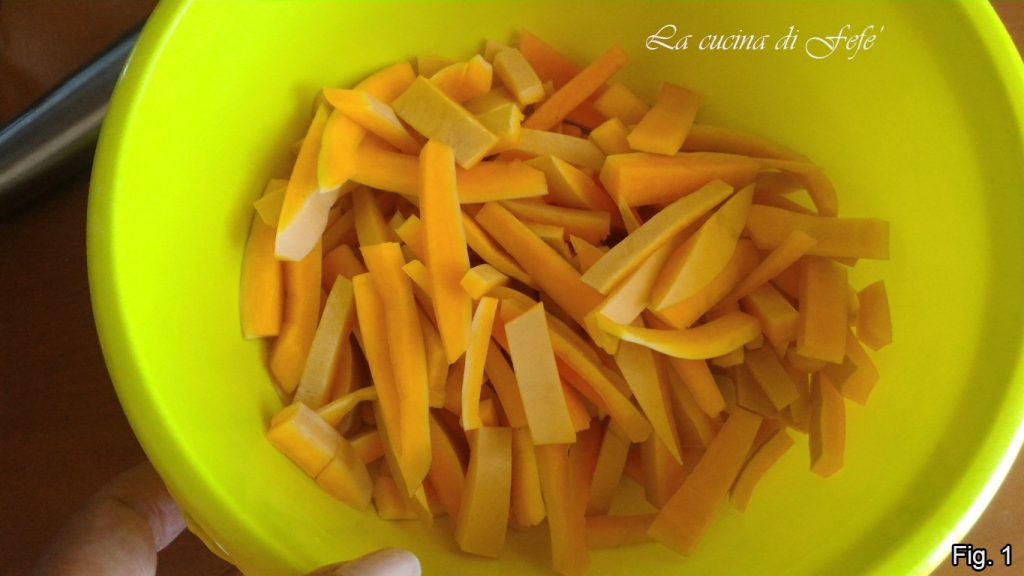 Lavez et coupez la peau de la citrouille en morceaux, puis faites tremper 30‘ avec de l’eau et du bicarbonate et rincez abondamment sous l’eau courante (fig. 1).