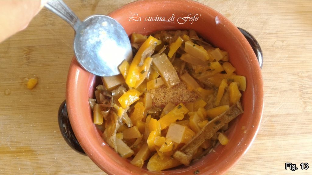Créez une première couche dans les deux cocottes, puis ajoutez au centre la moitié du provolone en dés et des copeaux de grana (fig. 14).