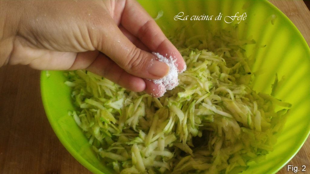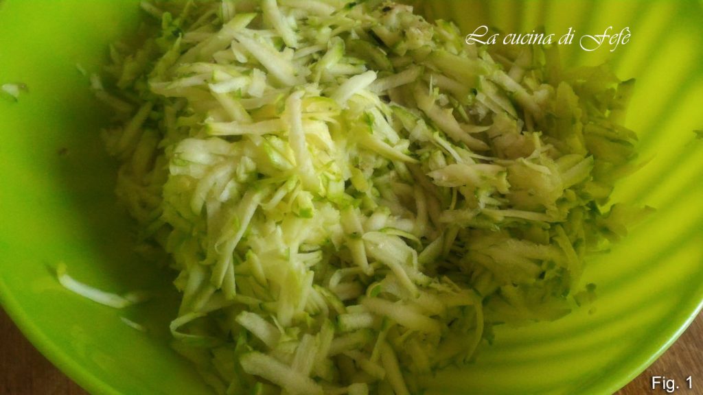 • Commencez par laver et équeuter les courgettes, puis râpez-les avec la râpe à gros trous et transférez-les dans un bol (fig. 1).
