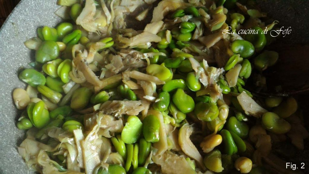 Dans la même eau où vous avez blanchi les artichauts, blanchissez également les fèves pendant 2′, égouttez et ajoutez-les à la sauce (fig. 2).