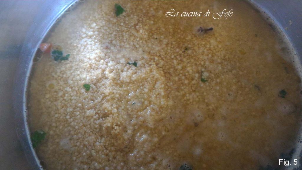 Entre-temps, massez le couscous cru avec deux cuillères d’huile, les épices, quelques feuilles de persil haché et les clous de girofle pendant quelques minutes (fig. 4).