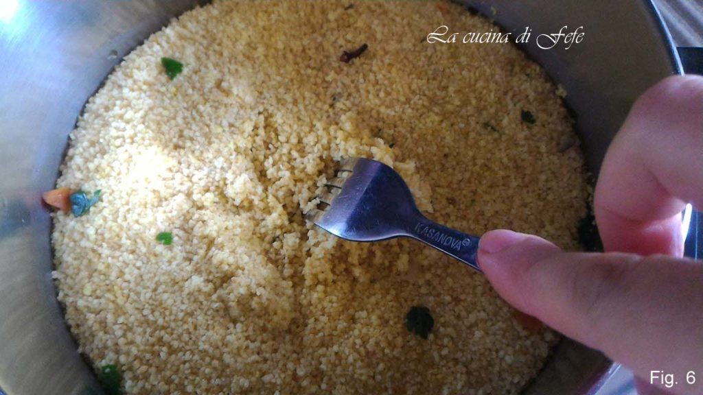 Laissez reposer 5′, puis égrenez avec les dents d’une fourchette (fig. 6).