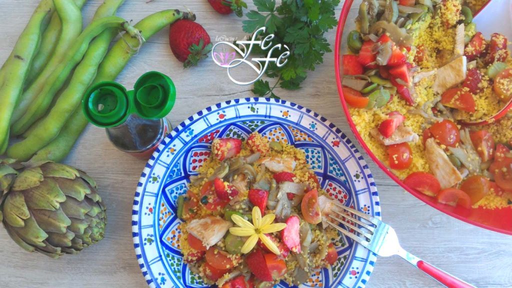 Je suis passionnée par la cuisine ethnique, on ne peut pas le nier ! J’aime reproduire de nombreuses recettes dont les ingrédients épicés sont capables, avec leur saveur, de remplacer en partie le sel ! Le couscous est l’un d’eux ! Après avoir appris l’art de la préparation d’une amie marocaine, j’essaie chaque fois d’appliquer la règle de base pour réaliser ce plat, pour ensuite le garnir de légumineuses et de légumes de saison. Aujourd’hui, je veux vous révéler ce secret, qui consiste à masser à cru et très lentement avec les mains les grains de semoule de blé avec le curcuma, le gingembre, le curry et l’ajout des clous de girofle, avant de les laisser cuire à la vapeur. Cela fait vraiment la différence ! Et voici ma proposition d’aujourd’hui, un plat réalisé il y a plusieurs semaines et que malheureusement je n’ai pu partager ici sur le blog que maintenant ! C’est un plat vivement coloré et attrayant qui s’inspire, comme toujours, de la cuisine moyen-orientale, car riche des arômes intenses des épices et de l’utilisation de la sauce soja, pour ensuite s’adapter aux saveurs et aux traditions de la cuisine méditerranéenne ! Alors, les derniers artichauts de l’hiver peuvent être remplacés par des asperges, mais vous trouverez aussi des fèves fraîches et surtout des fraises, avec leur arôme inimitable ! Un plaisir pour les yeux et le palais, à consommer comme plat unique avec les premiers frémissements printaniers. Extraordinairement riche en substances nutritives bénéfiques pour l’organisme, et donc essentiellement parfait pour affronter le changement de saison et faire le plein de vitamines et de sels minéraux !
