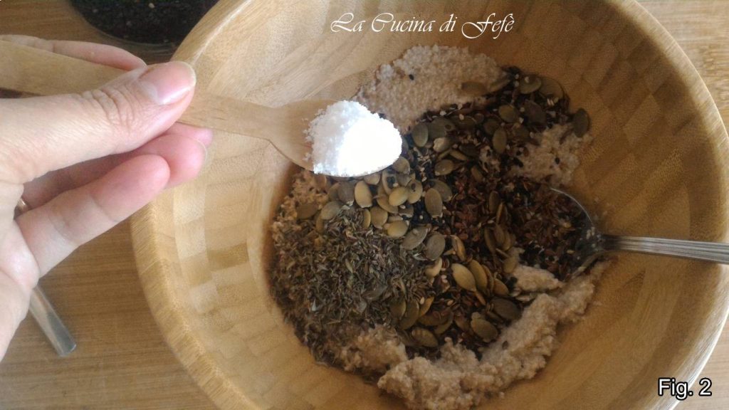 • Préparer les crackers aux graines mélangées et okara d’avoine est vraiment simple. Une fois le résidu extrait de l’autoproduction de lait d’avoine, prenez-en 250 grammes et transférez-les dans une terrine. Ajoutez le mélange de graines oléagineuses et mélangez avec une cuillère (fig. 1).