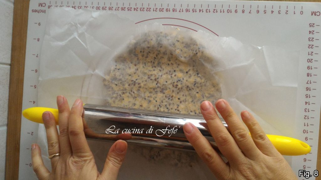 Transférez la pâte directement sur une plaque tapissée de papier sulfurisé, couvrez d’une autre feuille de papier sulfurisé et commencez à étaler la pâte avec un rouleau à pâtisserie (fig. 8).