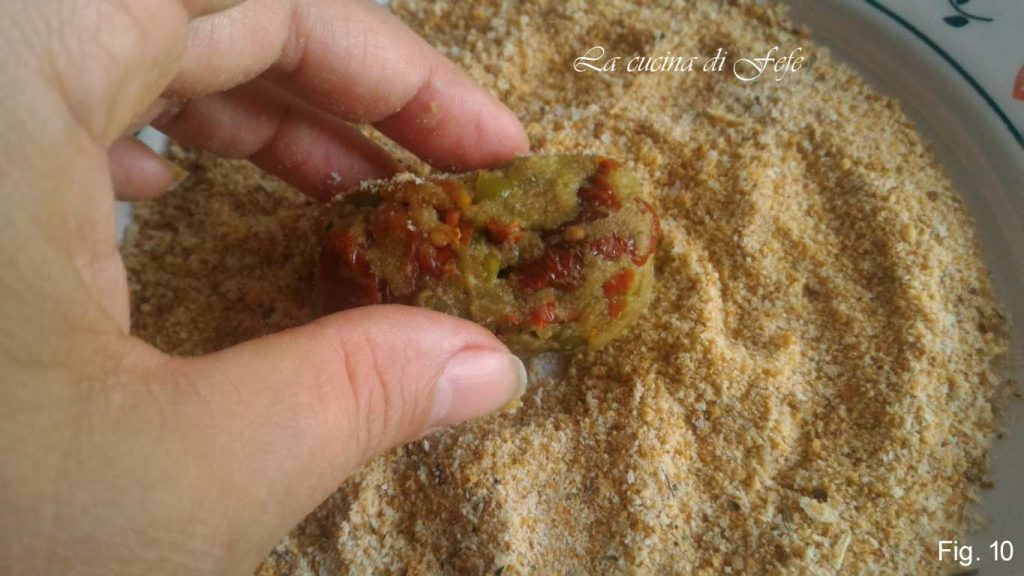 • Passez-les d’abord dans l’œuf restant battu avec la crème végétale et une pincée de sel, puis dans la chapelure en les roulant (fig. 10).