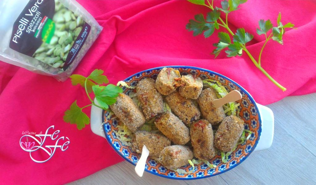 En cette période historique de grande difficulté pour nous tous, passer des journées entières à la maison sans même pouvoir mettre le nez dehors, nécessite la mise en place de divers stratagèmes pour occuper le temps de manière constructive et utile. Bien sûr, pour ce faire, mon principal moyen est de cuisiner, mais sans gaspillage, aujourd’hui plus que jamais du passé ! Et ainsi, à partir d’un bouillon de légumes restant, j’ai cuisiné la base pour ces croquettes vraiment délicieuses et savoureuses ! Les pois cassés, comme tous les légumineuses en général, une fois cuits, ont tendance à se compacter beaucoup, donc ils se prêtent à la réalisation de nombreuses préparations, surtout de boulettes saines et savoureuses. Ils sont en effet un aliment précieux pour notre organisme, en tant que source de fibres, de protéines, de sels minéraux et de vitamines. Si nous ajoutons à cette pâte un peu de farine de pois bio, parfaitement adaptée pour les coeliaques, une épice comme le gingembre et quelques tomates séchées de Pachino, nous aurons enrichi le tout et apporté à table un plat complet et équilibré au goût fortement savoureux ! Je les ai naturellement cuites au four, mais si vous préférez, vous pouvez aussi les faire frire et les transformer en amuse-gueule appétissants en début de repas.
