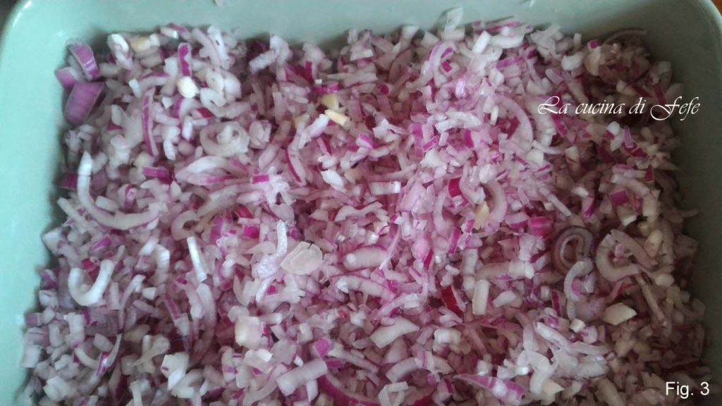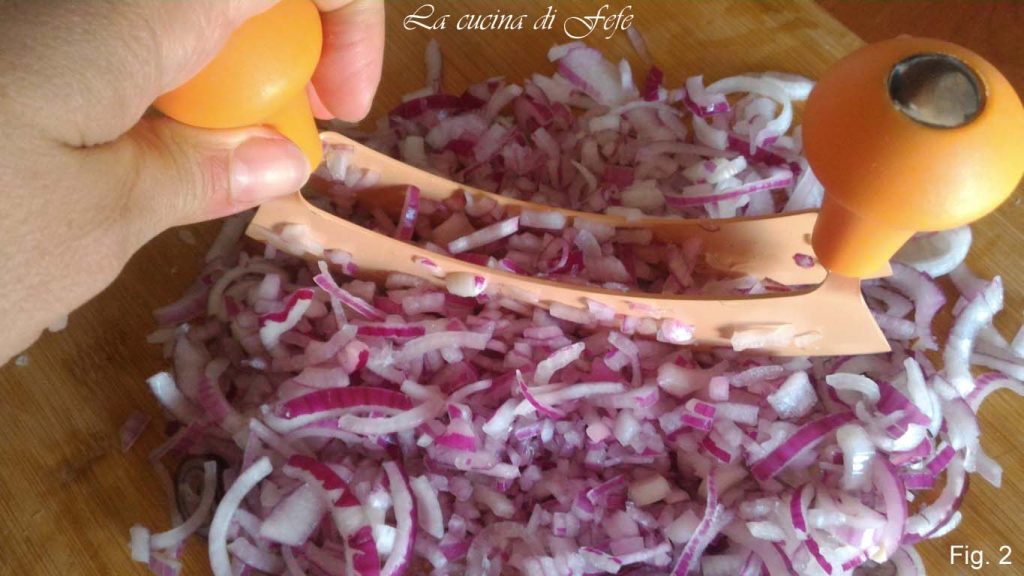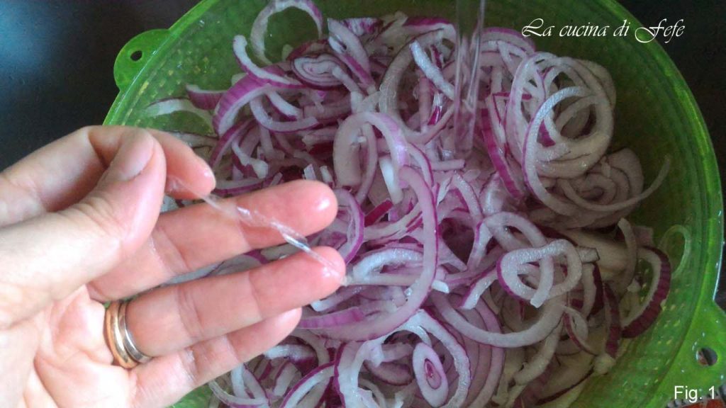 Épluchez vos oignons de Tropea, éliminez les deux extrémités, coupez-les en rondelles, en les débarrassant sous l’eau courante de leur pellicule interne transparente qui les rend moins digestes (fig. 1).