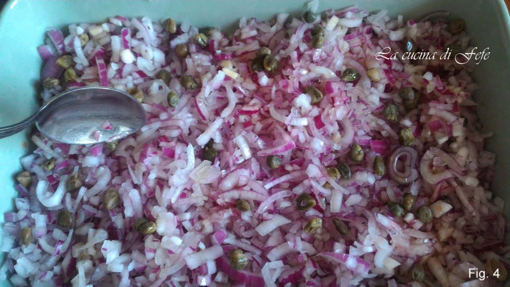 Ajoutez les câpres dessalés sous l’eau courante et bien pressés, le vinaigre, un filet d’huile, une pincée de sel et le piment (fig. 4).