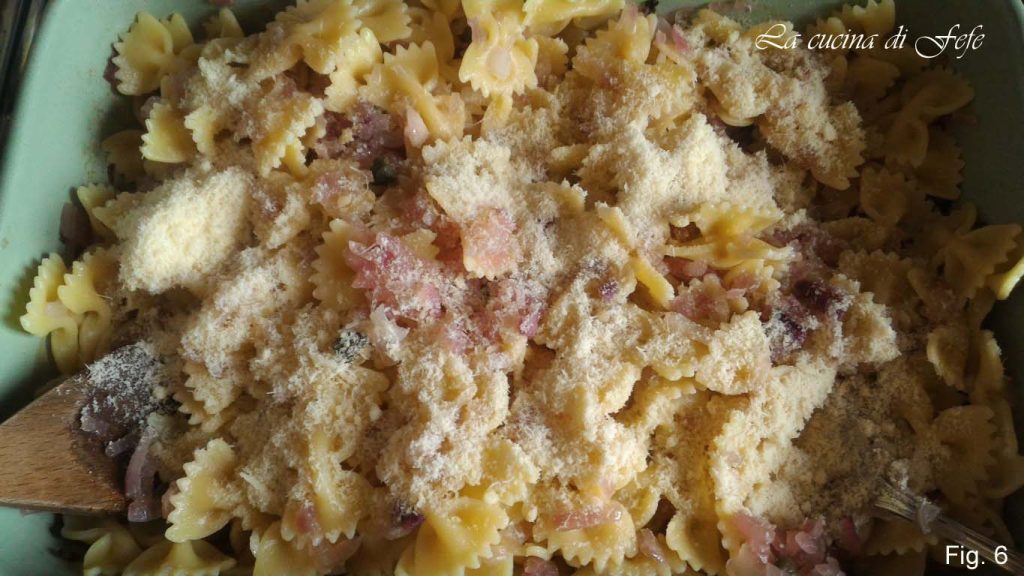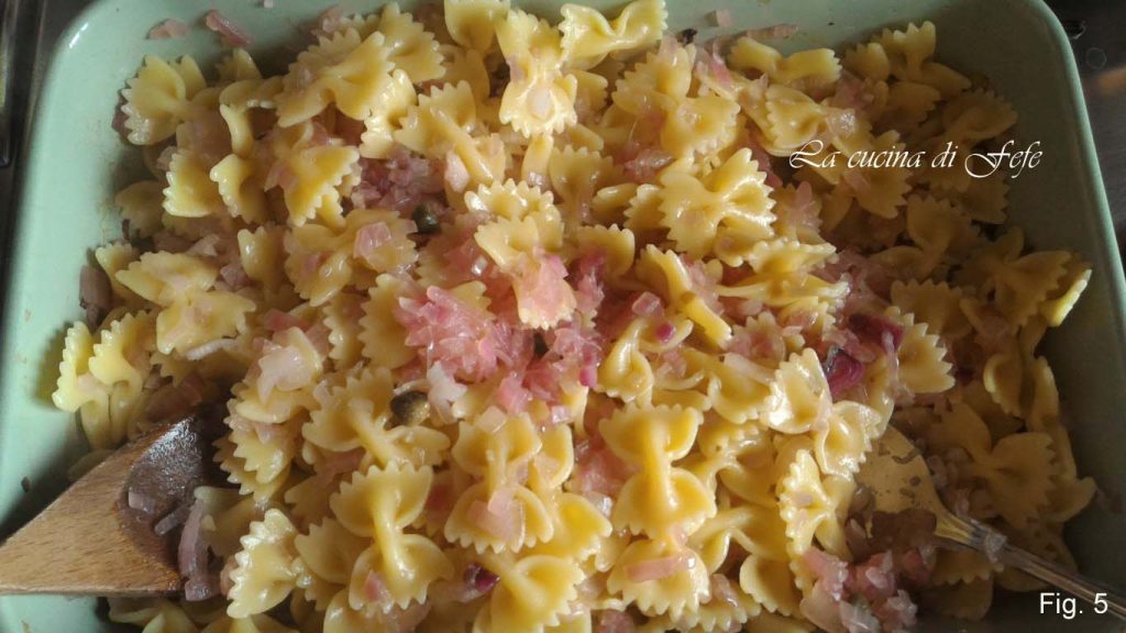 Mettez au four à 180°C pendant environ 30′. Pendant ce temps, faites cuire les farfalle dans une grande quantité d’eau salée, en veillant à en réserver un peu. En fin de cuisson, égouttez les pâtes et versez-les dans le plat contenant les oignons fondus (fig. 5).