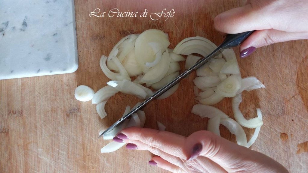 • Maintenant, occupe-toi de peler un oignon et de le hacher finement au couteau.