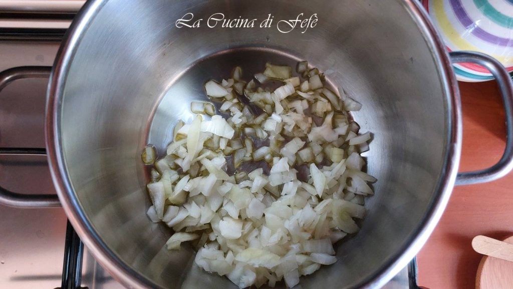 • Fais-le revenir à feu doux avec un généreux filet d’huile d’olive extra vierge dans une grande casserole, moi j’ai utilisé l’autocuiseur qui réduit les temps de cuisson*.
