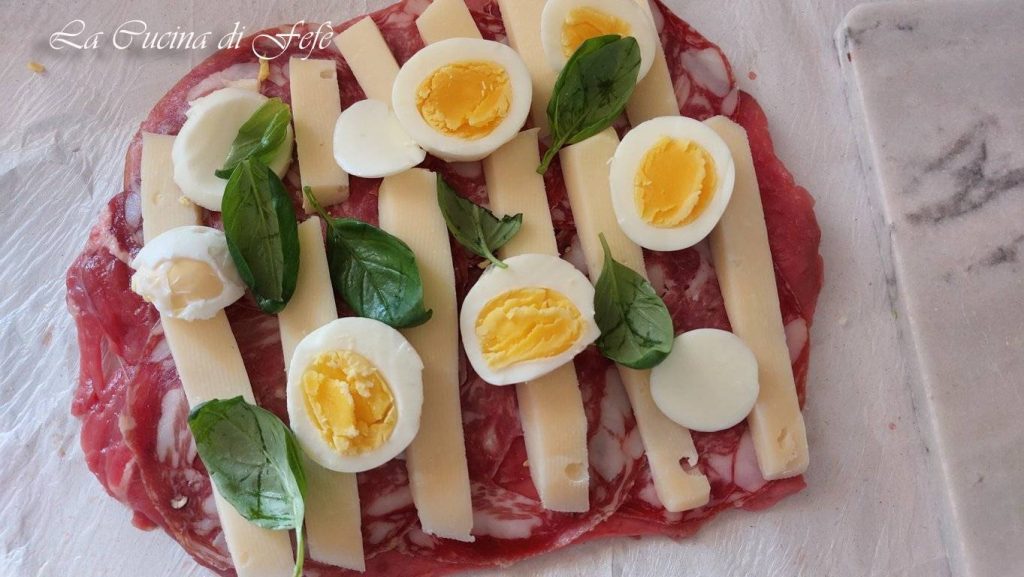 🟣Outre la recette traditionnelle, il existe de nombreuses variantes du faux maigre. Certaines recettes prévoient l’ajout d’autres ingrédients dans la garniture, comme la viande de veau hachée mélangée avec le pecorino râpé, la mortadelle ou le jambon cuit à la place du salami, etc. D’autres recettes prévoient de cuire le faux maigre dans un hachis de carottes et de céleri avec l’oignon. Bref, on peut expérimenter la recette qu’on préfère et s’amuser à la personnaliser à son goût.
