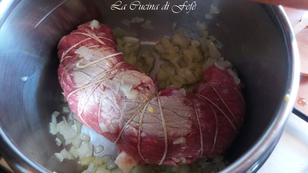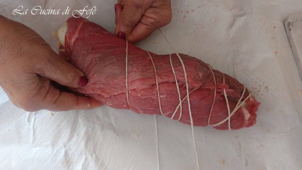 • À ce stade, roule la viande sur elle-même du côté le plus long, en essayant d’empêcher la garniture de s’échapper.