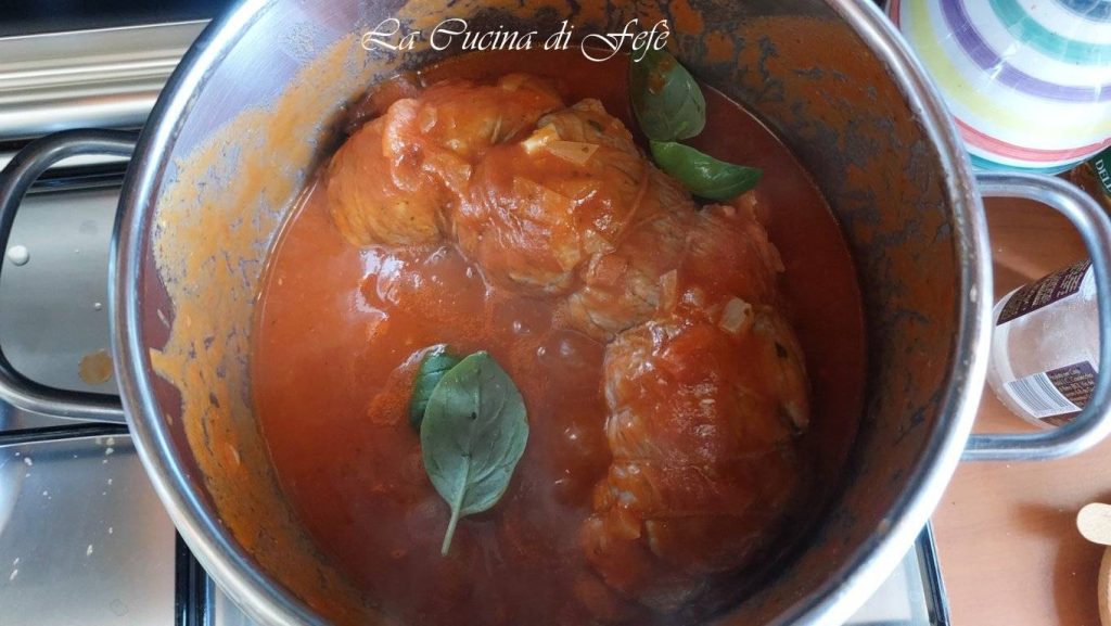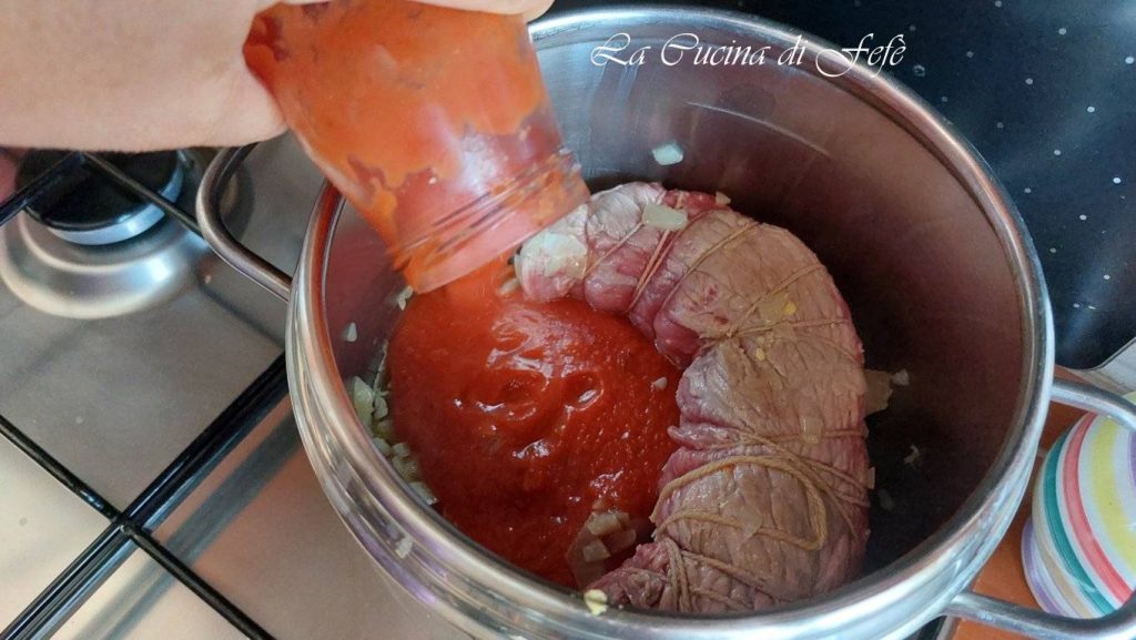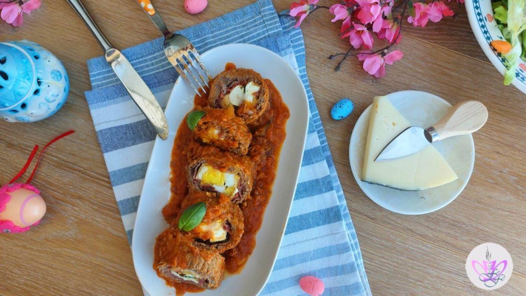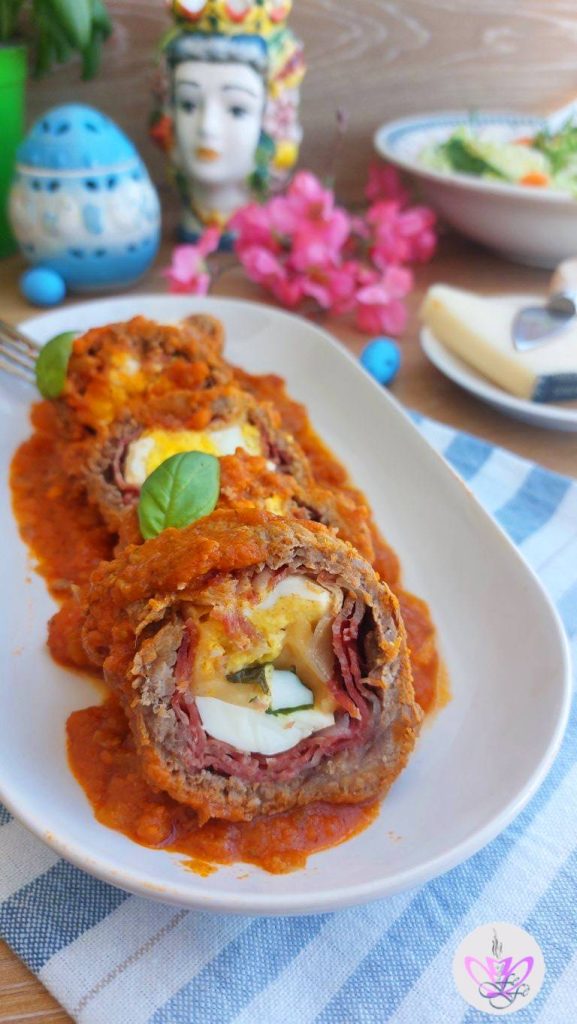Le fassumàuru co sugu, autrement dit le faux maigre à la sauce, est l’un des plats principaux de la tradition sicilienne les plus connus et typiques du dimanche et des jours de fête, comme Noël ou Pâques. Un véritable incontournable de notre cuisine, dont le nom pompeux en dit déjà long ! L’expression « faux maigre« , en effet, laisse entendre que l’apparence de ce rouleau de viande étroit et long est trompeuse, car, une fois tranché, il révélera sa véritable nature riche et consistante avec des charcuteries, du fromage et des œufs! La préparation du faux maigre nécessite un peu de compétence et de patience. Une fois farcie, la viande doit être roulée et solidement attachée pour maintenir sa forme pendant la longue cuisson dans la sauce, qui la rendra tendre et savoureuse. Une recette somptueuse en somme, au point que même le gastronome Pino Correnti l’a définie comme « le souverain incontesté des plats de viande en Sicile« ! De plus, ces plats traditionnels de la cuisine sicilienne sont de véritables piliers pour chaque famille qui se respecte ! De génération en génération, chacune transmet sa propre version, contribuant ainsi à maintenir la mémoire vivante. La recette que je partage ici avec toi est justement le fruit de cet héritage. Ma mère parle souvent de ce plat que son grand-père Antonio préparait et qu’elle a jalousement gardé toutes ces années, après l’avoir appris à son tour de ma grand-mère Elvira, jusqu’à nos jours entre mes mains ! Et c’est avec elle que j’ai préparé avec émotion et dévouement cette recette pour te l’offrir également !
