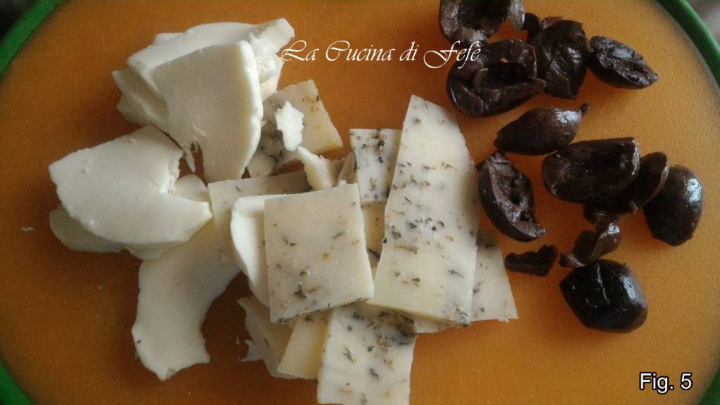 Pendant ce temps, sur une planche, dénoyautez les olives et coupez-les en rondelles ainsi que le fromage.