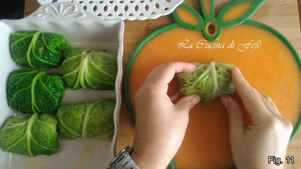 Lavez soigneusement 8 grandes feuilles de chou de Milan bien croquantes, puis, avec un couteau, retirez la côte centrale qui est plus coriace et moins agréable à manger.