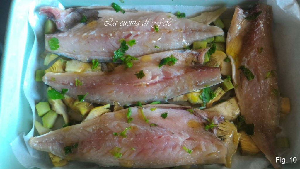 • Tamponnez les filets avec du papier absorbant et mettez de côté. Disposez les quartiers d’artichauts sur une plaque recouverte de papier sulfurisé. Assaisonnez de sel si nécessaire, poivrez et assaisonnez avec de l’ail en poudre à votre goût, un filet d’huile, de la sauge et du persil haché grossièrement (fig. 9).