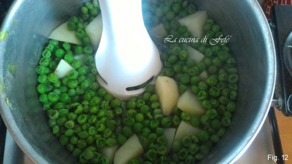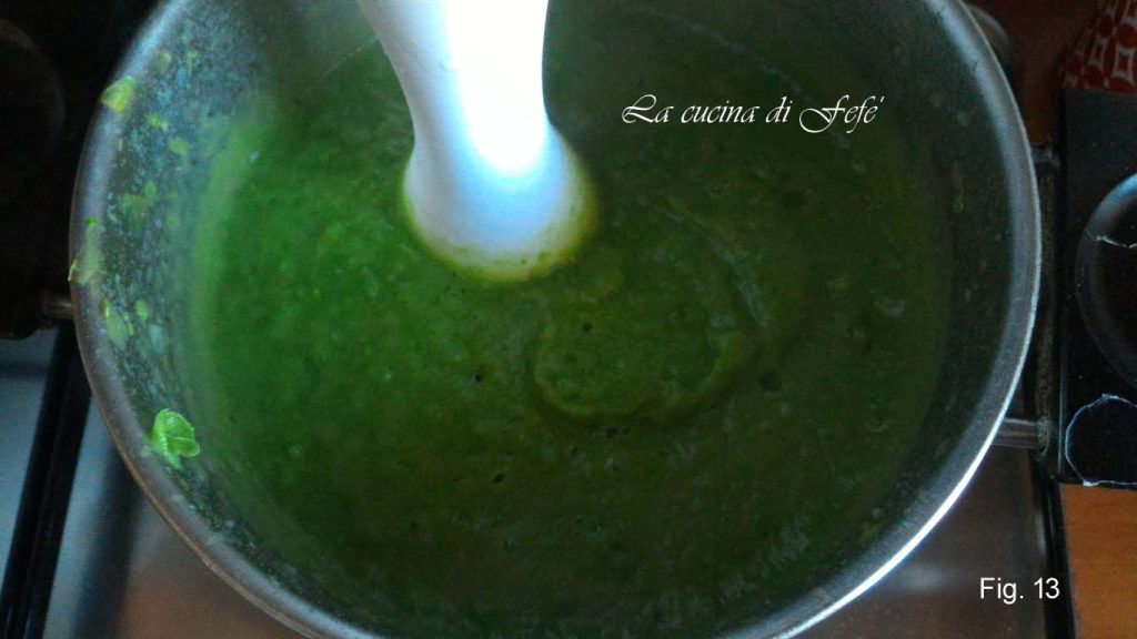 • Mettez au four préchauffé à 180°C pendant 20′. Pendant ce temps, éteignez les légumes, éliminez l’excès de bouillon que vous devrez garder de côté si nécessaire et mixez-les avec un mixeur plongeant (fig. 11).
