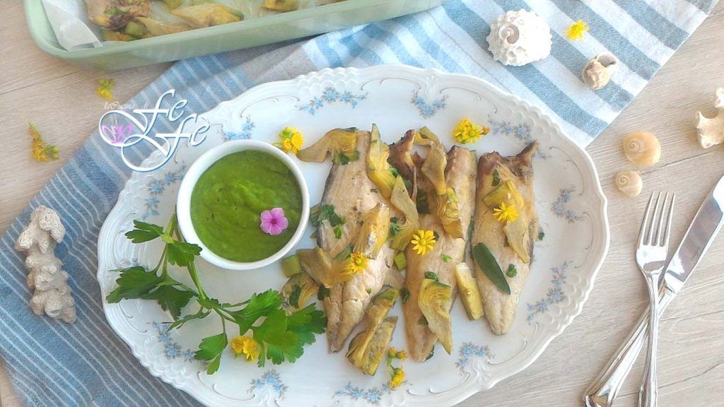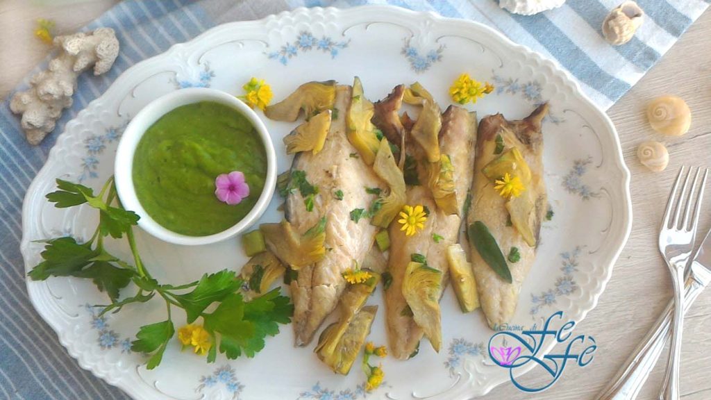 FILETS DE MAQUEREAU AVEC QUARTIERS D’ARTICHAUTS EN CRÈME DE PETITS POIS