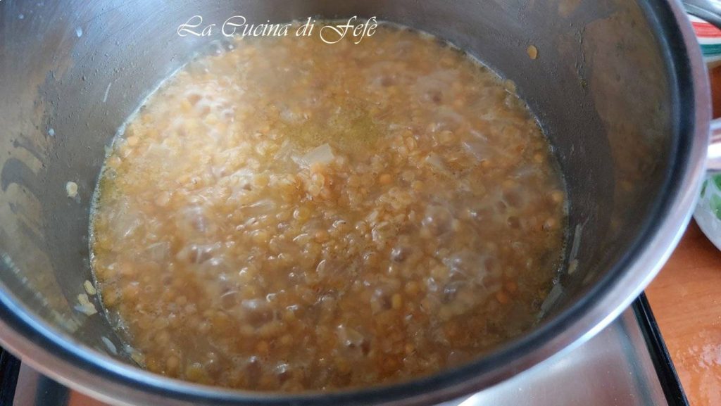 • Versez ensuite le bouillon de légumes chaud jusqu’à couvrir entièrement les lentilles. Portez à ébullition, couvrez avec un couvercle en laissant une petite ouverture et poursuivez la cuisson à feu doux pendant 15′ ou selon les temps de cuisson indiqués sur votre emballage.