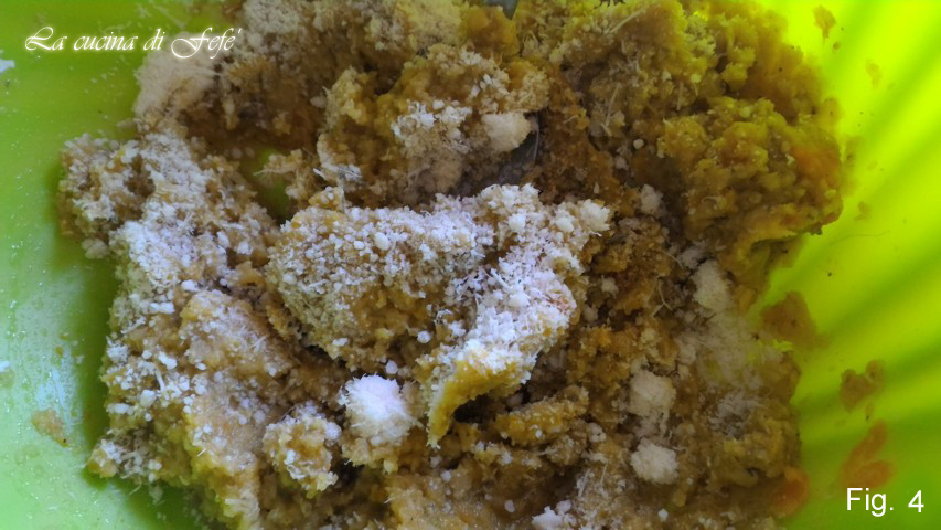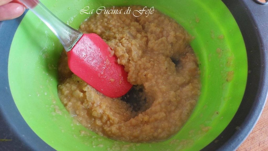 • Écrasez les lentilles avec l’aide d’une cuillère jusqu’à les réduire en purée. Ajoutez ensuite également le parmigiano et le pecorino râpés et mélangez.