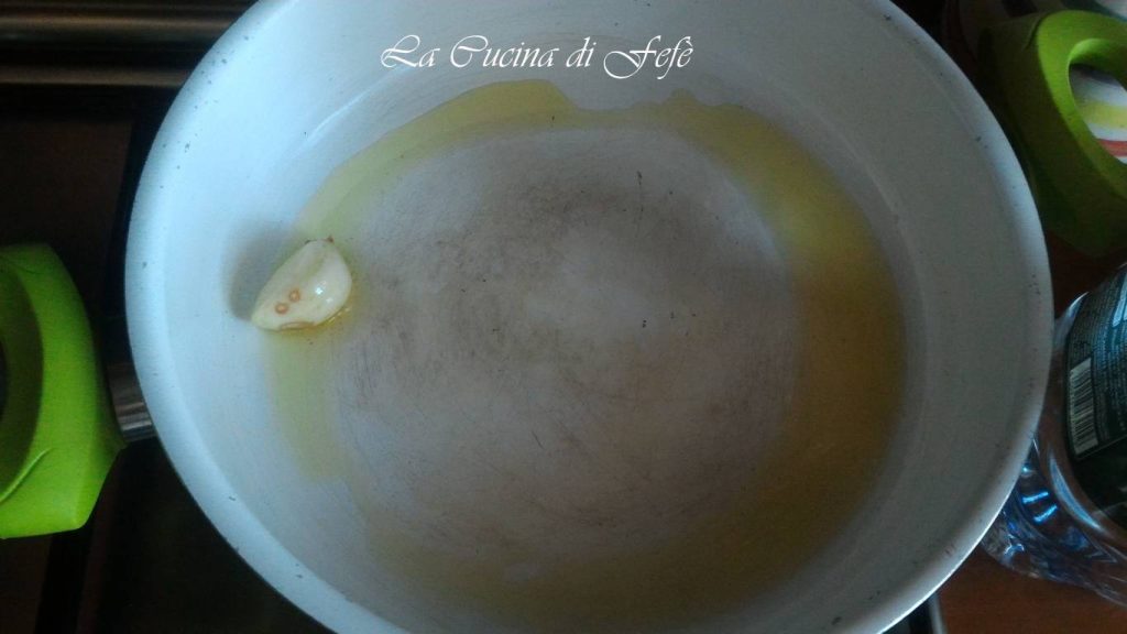 Dans une grande casserole, fais dorer l’ail avec deux cuillères à soupe d’huile.