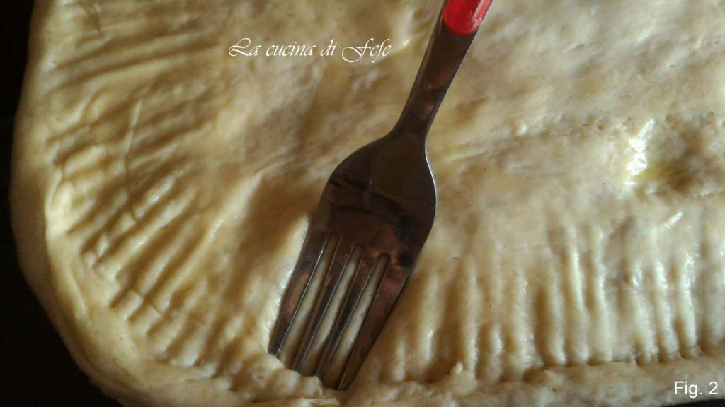 Reprenez la pâte et étalez-la avec les mains sur une plaque bien huilée et couvrez d’un torchon. Laissez reposer à l’intérieur du four éteint pendant 3/4 h. Puis créez un cadre en pressant les bords avec les dents d’une fourchette (fig. 2)