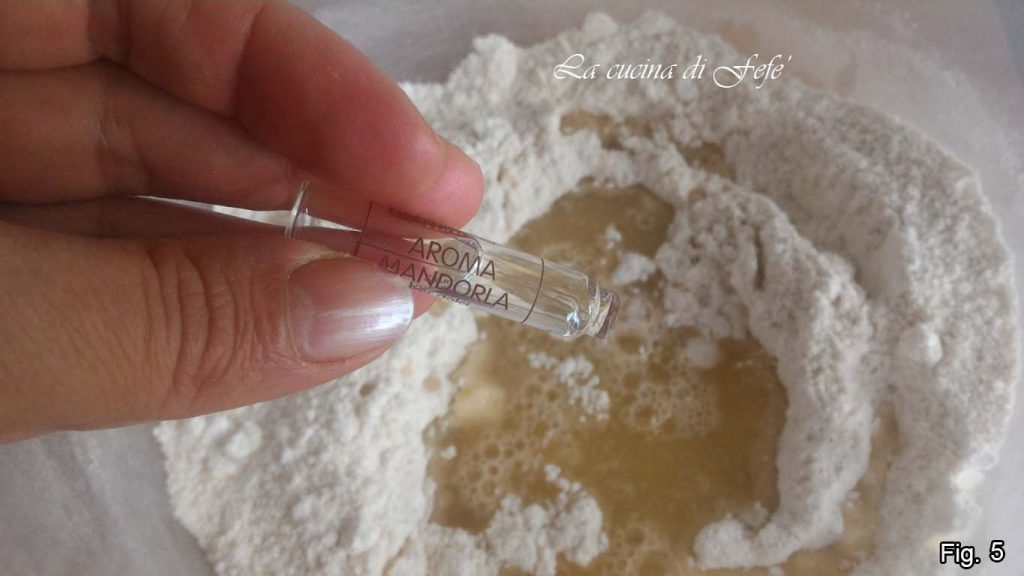Incorporez les ingrédients liquides aux poudres, aromatisez avec l’arôme d’amande et mélangez jusqu’à obtenir un mélange homogène (fig. 5).