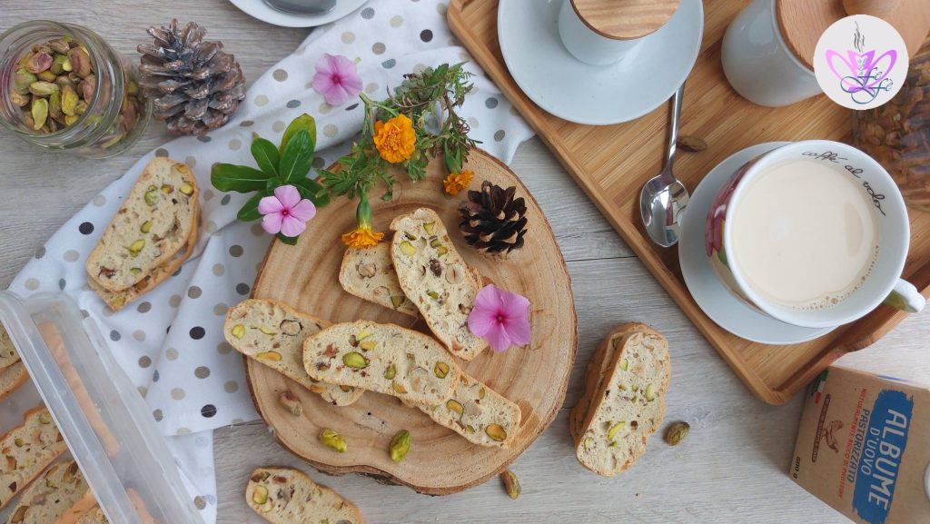 Si vous m’avez suivi sur les réseaux sociaux, vous saurez que j’ai récemment expérimenté une recette qui rappelle par son aspect et son croquant les mythiques cantuccis ! Je les ai appelées galettes et elles sont encore plus saines, car sans beurre. Elles sont vraiment fantastiques à grignoter au goûter ou en fin de repas. L’autre soir, mon mari les a même trempées dans du zibibbo, un vrai régal ! Quoi qu’il en soit, pour ceux qui le souhaitent, il est possible de remplacer les blancs d’œufs par de l’eau de cuisson de pois chiches, la fameuse aquafaba, et de réaliser ainsi des galettes véganes. Je les ai enrichies de noisettes et pistaches, mais rien n’empêche de les réaliser aussi avec des amandes, des pignons de pin ou des noix. Vu le succès qu’elles ont eu, je vous proposerai bientôt une autre version encore plus riche, alors ne la manquez pas, je vous le recommande !