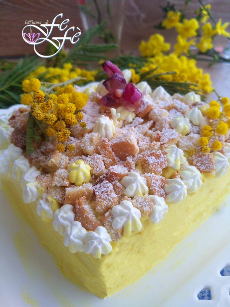 La préparation est très simple : on alterne des couches de pâte biscuit et de fausse crème diplomatique (crème pâtissière légère mélangée à un peu de crème végétale ou de yaourt grec). La touche finale ? L’effet traditionnel « fleur de mimosa » réalisé avec les cubes de pâte biscuit restants.