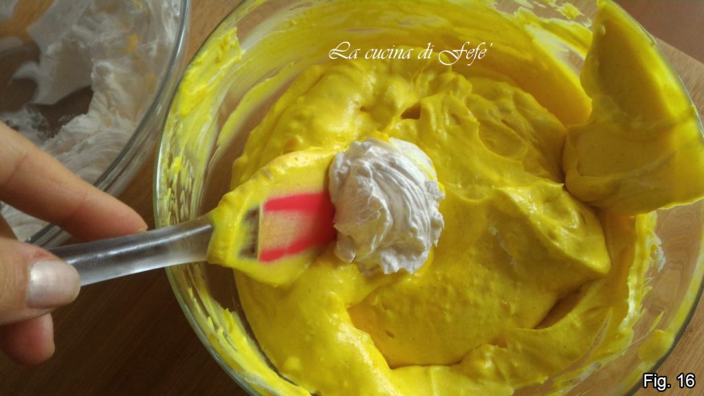 Quand vous obtenez un mélange clair et mousseux, incorporez le sucre et continuez à fouetter à pleine puissance pendant au moins 5 minutes supplémentaires. Étant donné que la pâte biscuit ne contient pas de levure, l’air est le seul allié.